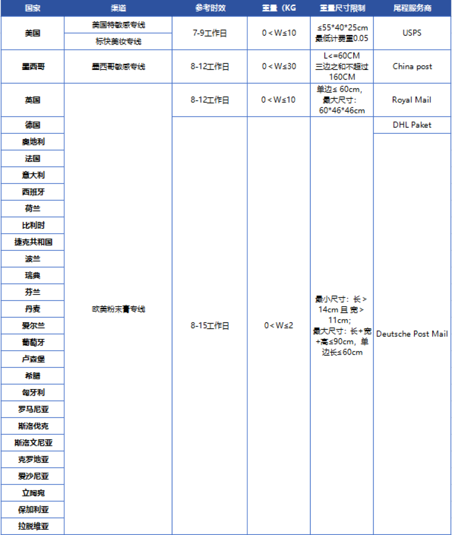 欧美小包敏感专线,是我司专为跨境电商卖家开发的商业专线,渠道覆盖欧盟、北美、英国等国家,可收寄带电类、美妆、液体、膏体、厨房刀具等特货,时效预估7-12个工作日。此渠道时效快,发货属性广泛,能帮助客户解决行业痛点、助力客户海外拓展。